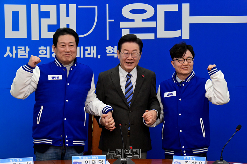 이재명 더불어민주당 대표가 14일 오전 국회에서 열린 18·19차 인재영입식에서 유동철 동의대학교 사회복지학과 교수, 김상우 안동대학교 경영학과 교수 등 참석자들과 기념촬영을 하고 있다.