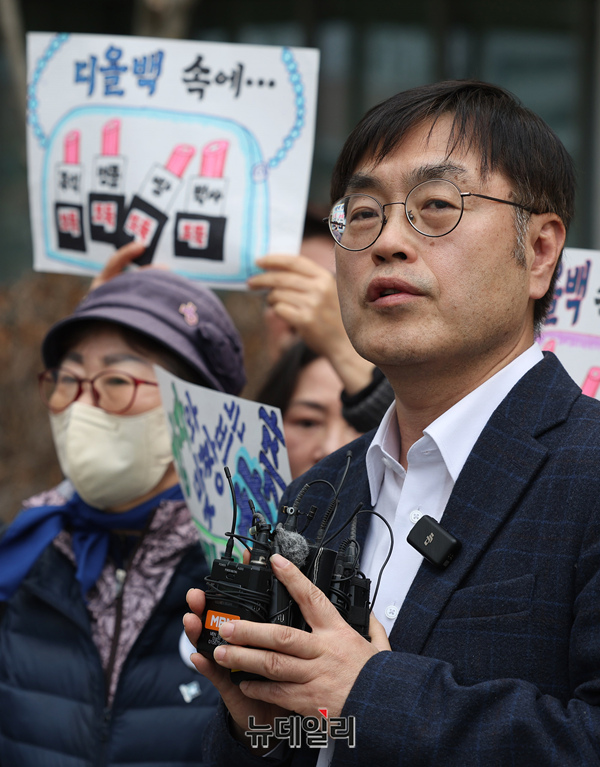 오세훈 서울시장 배우자의 강의실에 몰래 들어가 녹음을 시도한 혐의를 받는 강진구 전 더탐사 대표가 14일 오후 서울 송파구 동부지법에서 1심 선고 직후 법원에서 입장을 밝히고 있다. 법원은 이날 강 전 대표에게 무죄를 선고했다.