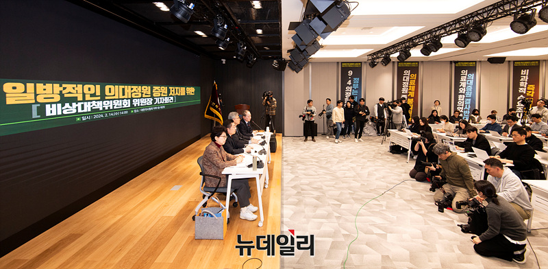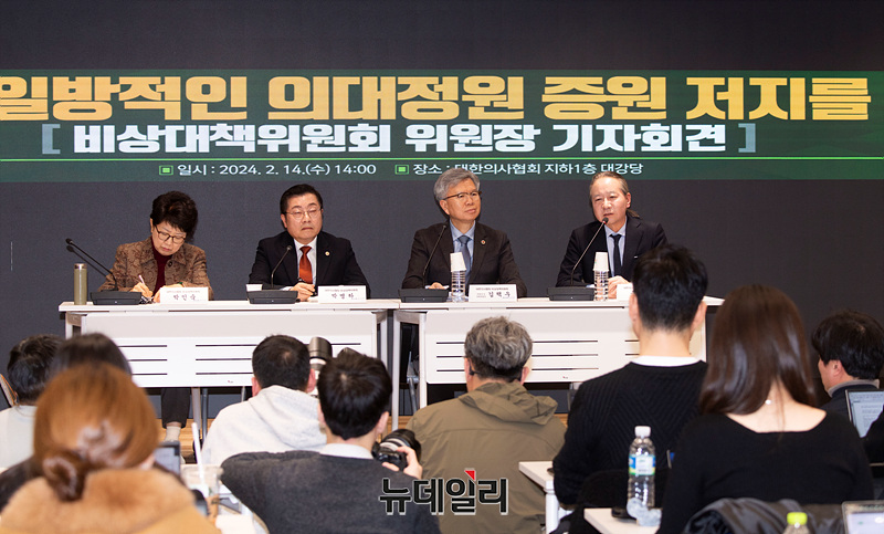 김택우 대한의사협회 비상대책위원장과 참석자들이 14일 오후 서울 용산구 대한의사협회 회관에서 열린 '정부의 일방적인 의대정원 증원 저지를 위한 비상대책위원회 위원장 기자회견'에서 취재진의 질문에 답하고 있다.