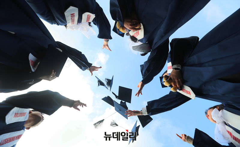 국민대 졸업생들이 14일 오전 서울 성북구 국민대학교에서 열린 '2023학년도 전기 학위수여식'에서 학위모를 던지며 졸업을 자축하고 있다.