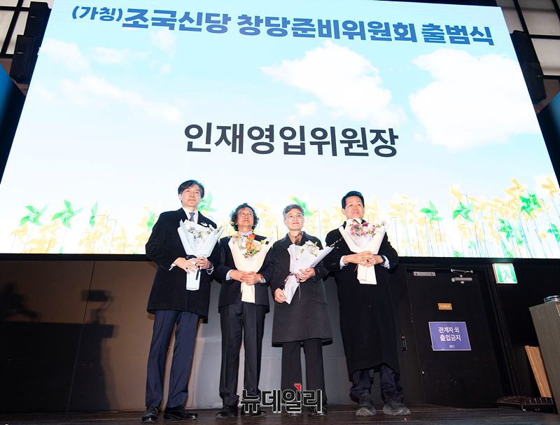 조국 조국신당(가칭) 인재영입위원장이 15일 오전 서울 동작구 아트나인에서 열린 조국신당(가칭) 창당준비위원회 출범식에서 김호범, 강미숙, 은우근 공동준비위원과 기념촬영을 하고 있다.
