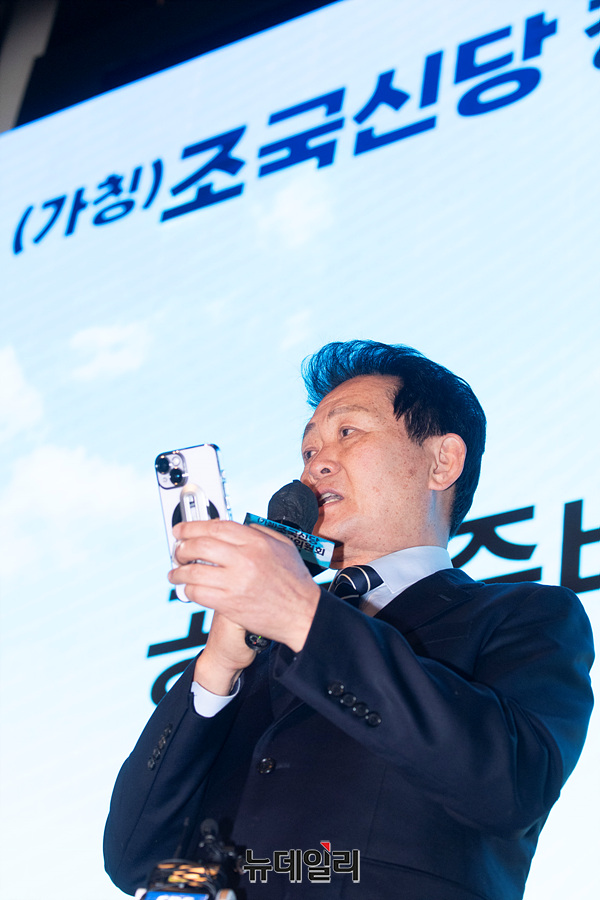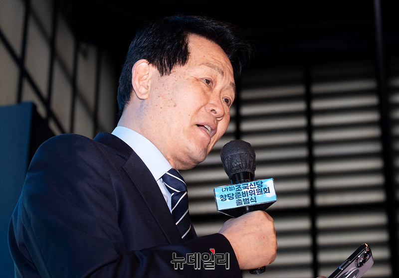 은우근 조국신당(가칭) 창당준비위원장이 15일 오전 서울 동작구 아트나인에서 열린 조국신당(가칭) 창당준비위원회 출범식에서 발언하고 있다.