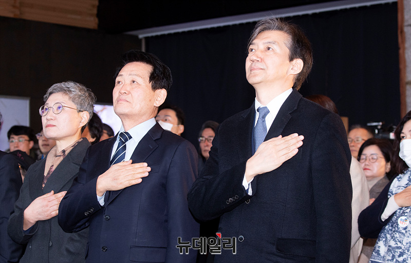 조국 조국신당(가칭) 인재영입위원장과 참석자들이 15일 오전 서울 동작구 아트나인에서 열린 조국신당(가칭) 창당준비위원회 출범식에서 국민의례를 하고 있다.