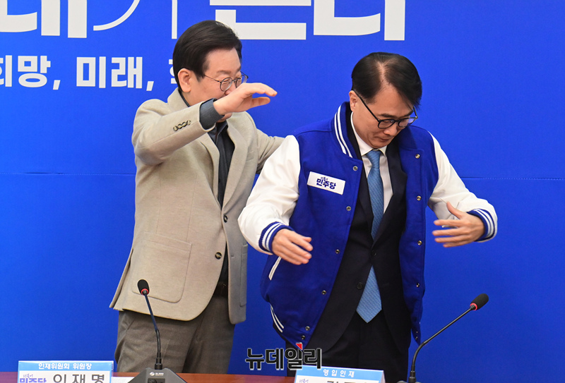 이재명 더불어민주당 대표가 16일 오전 국회에서 열린 20·21·22차 인재환영식에서 김준환 전 국가정보원 차장과 기념촬영을 하고 있다.