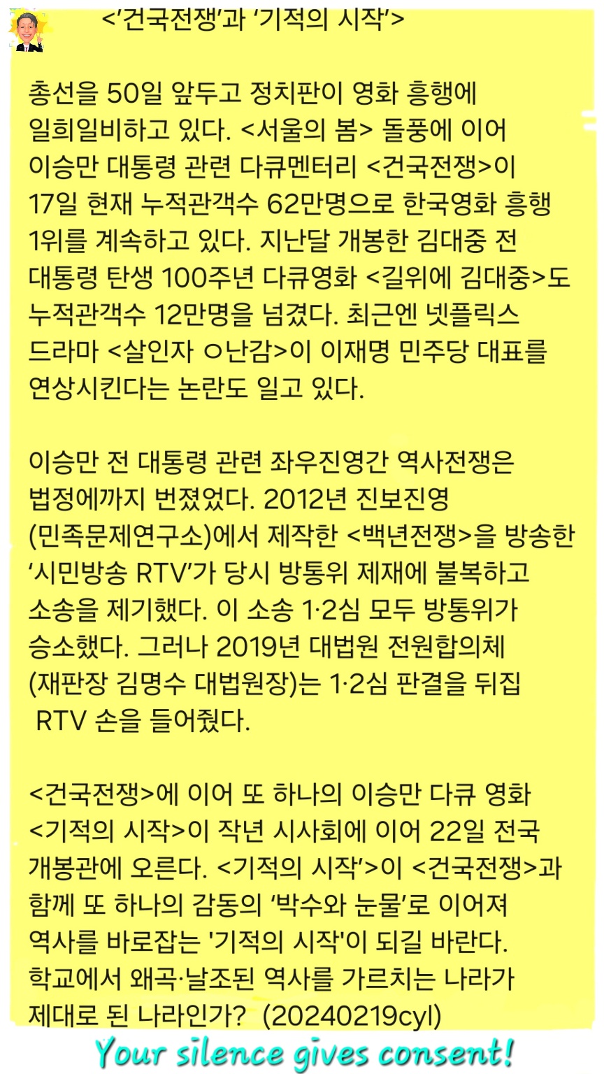 <’건국전쟁’과 ‘기적의 시작’>총선을 50일 앞두고 정치판이 영화 흥행에 일희일비하고 있다.