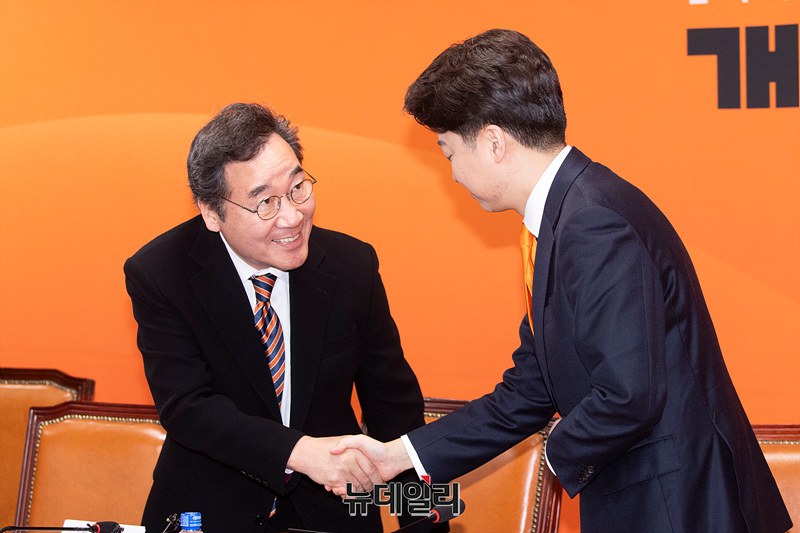 이준석 개혁신당 공동대표가 19일 오전 국회에서 열린 최고위원회의에 참석하며 이낙연 공동대표에게 인사하고 있다.
