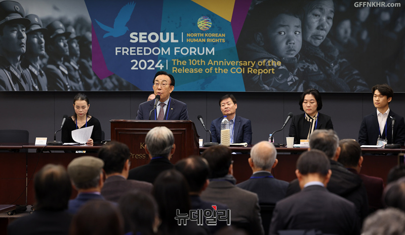 원코리아네트워크와 한미동맹USA재단이 유엔 북한인권조사위원회(COI)의 북한인권 보고서 발간 10주년을 기념해 마련한 제1회 북한인권 서울프리덤포럼이 19일 오전 서울 중구 한국프레스센터에서 개최되고 있다.포럼에는 김관용 민주평화통일자문회의 수석부의장, 줄리터너 미국 국무부 북한인권특사(영상), 강철환 북한전략센터 대표, 송한나 북한인권정보센터장 등이 참석했다.이어 손혜영 나타샤재단 대표, 황지성 탈북민 구출 활동가, 박정오 큰샘 대표, 오은경 상담심리전문가, 김일혁 활동가 등이 발표자로 나섰다.