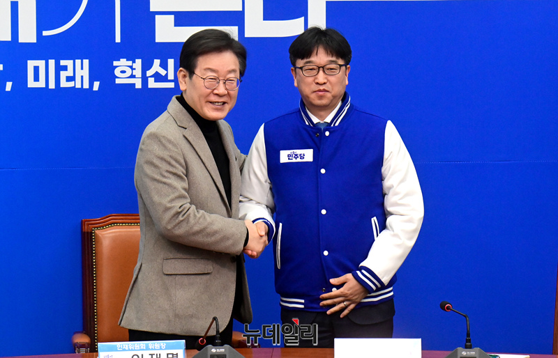 이재명 더불어민주당 대표가 19일 오전 국회에서 열린 23·24·25차 인재영입식에서 이용우 변호사에게 당 점퍼를 선물하고 기념촬영을 하고 있다.