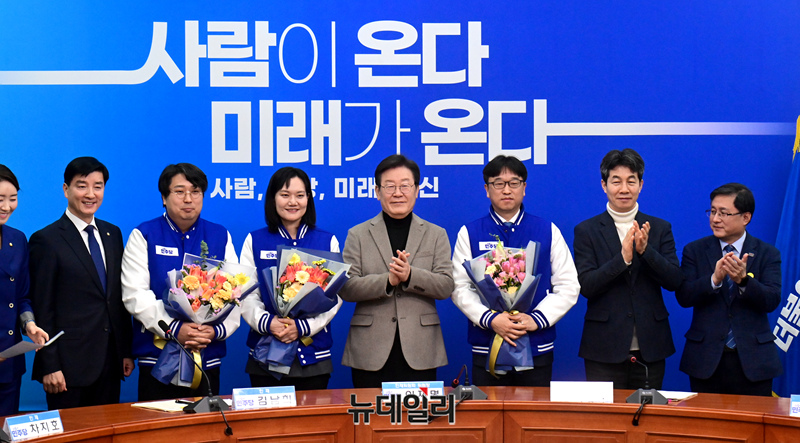 이재명 더불어민주당 대표가 19일 오전 국회에서 열린 23·24·25차 인재영입식에서 이용우 변호사, 김남희 변호사, 차지호 교수와 기념촬영을 하고 있다.