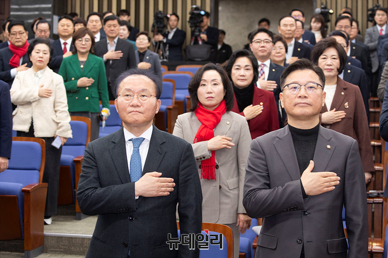 국민의힘 의원들이 19일 오후 국회에서 열린 의원총회에서 국민의례를 하고 있다.