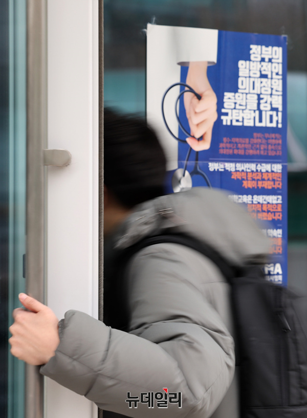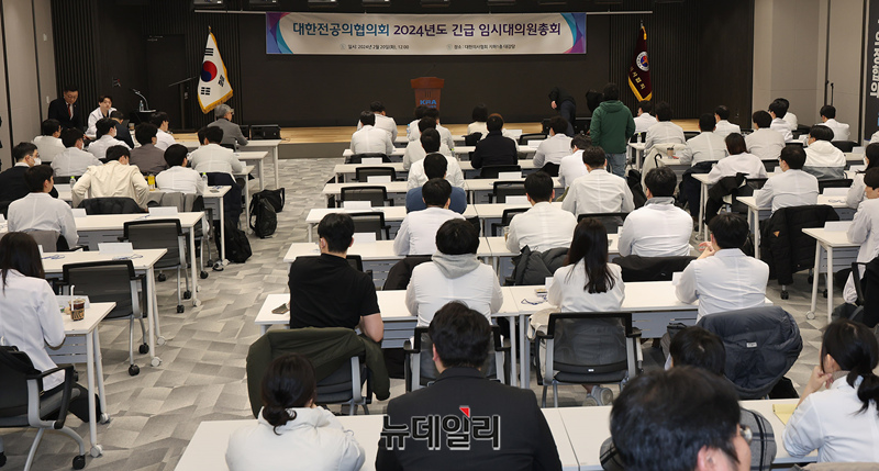 정부의 의대 증원 방침에 반발한 전공의 대표들이 20일 서울 용산구 대한의사협회에서 대한전공의협의회 긴급 임시대의원총회를 열고 자리하고 있다.
