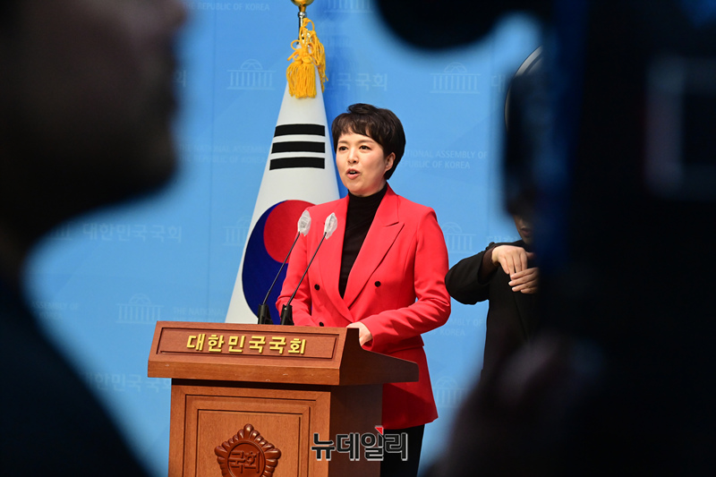 김은혜 전 대통령실 홍보수석이 21일 오후 국회 소통관에서 제22대 국회의원 선거 분당을 출마 선언을 하고 있다.