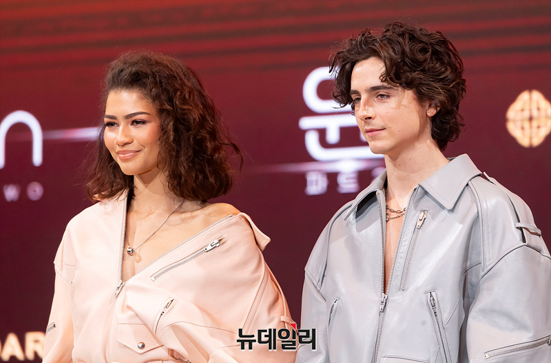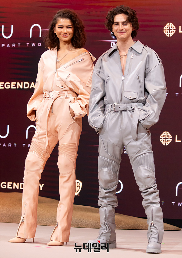 할리우드 배우 젠데이아와 티모시 살라메가 21일 오후 여의도 콘래드 서울에서 열린 '듄: 파트 2(김독=드니 빌뇌브) 프레스 컨퍼런스'에서 포즈를 취하고 있다.