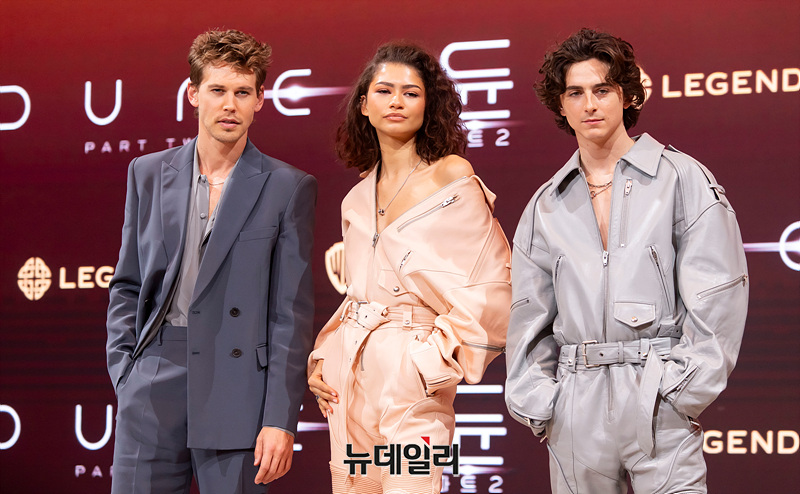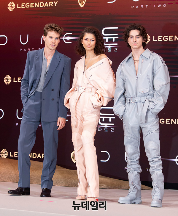 할리우드 배우 오스틴 버틀러(왼쪽부터), 젠데이아, 티모시 샬라메가 21일 오후 여의도 콘래드 서울에서 열린 '듄: 파트 2(김독=드니 빌뇌브) 프레스 컨퍼런스'에서 포즈를 취하고 있다.