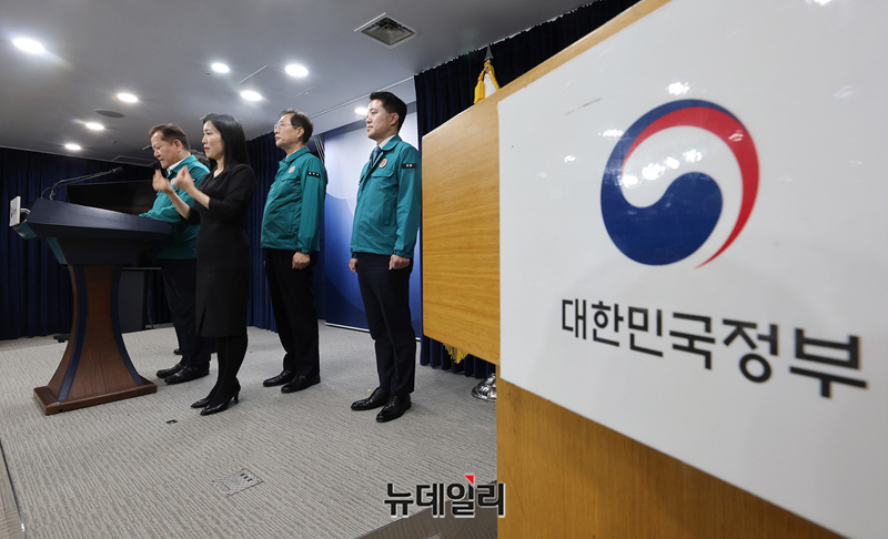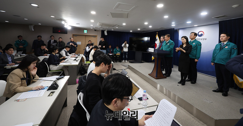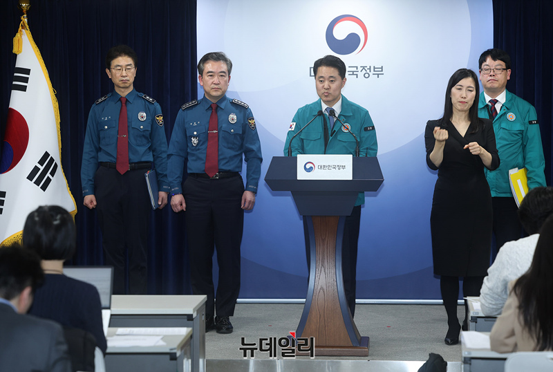 이상민 행정안전부 장관, 박성재 법무부 장관, 윤희근 경찰청장, 신자용 대검찰청 차장검사 등이 21일 서울 종로구 정부서울청사에서 열린 '의대 입학정원 확대에 반발한 의료계의 집단행동' 관련 공동브리핑에 입장하고 있다.정부는 △불법 집단행동에 가담한 의료인과 집단행동을 배후에서 조종하거나 교사하는 자들까지 수사로 규명해 엄단 △불법 집단행동 가담의 정도가 중하고 이로 인해 중대한 피해가 발생한 경우 엄중 처벌 한다고 밝혔다.또 대한법률구조공단, 법률홈닥터, 마을변호사 등 법률지원 인프라를 활용해 법률상담, 소송구조 등 다양한 방식으로 피해회복을 위한 법률지원도 함께 할 예정이다.공동브리핑에는 법무부, 행정안전부, 대검찰청, 경찰청이 참석했다.