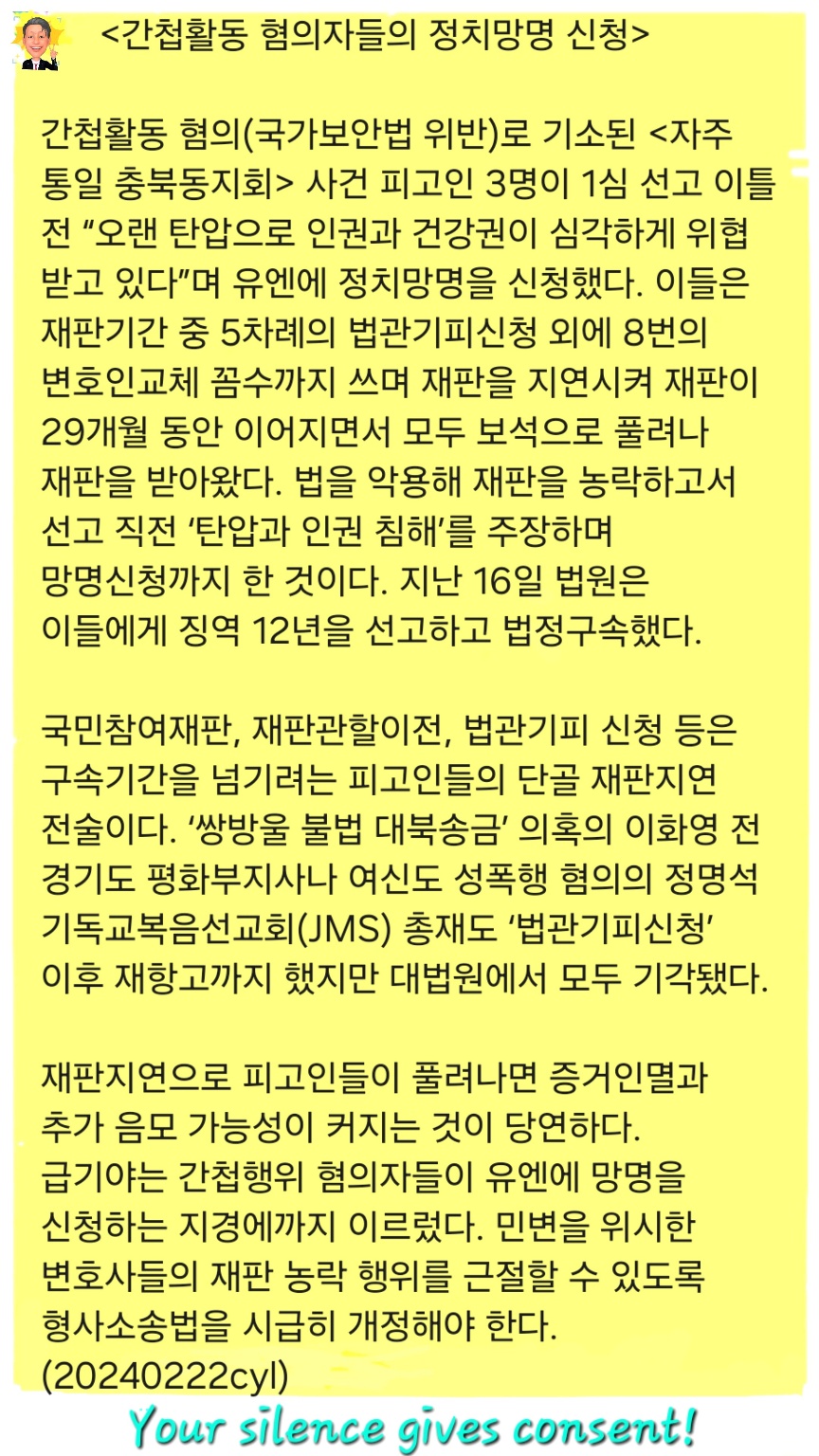 <간첩활동 혐의자들의 정치망명 신청>간첩활동 혐의(국가보안법 위반)로 기소된 <자주통일 충북동지회> 사건 피고인 3명이 1심 선고 이틀 전 “오랜 탄압으로 인권과 건강권이 심각하게 위협받고 있다” 며 유엔에 정치망명을 신청했다.