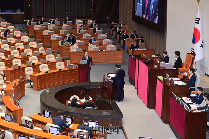 한덕수 국무총리가 23일 오후 국회에서 열린 본회의 경제 분야 대정부질문에 참석해 의원들의 질문에 답하고 있다.