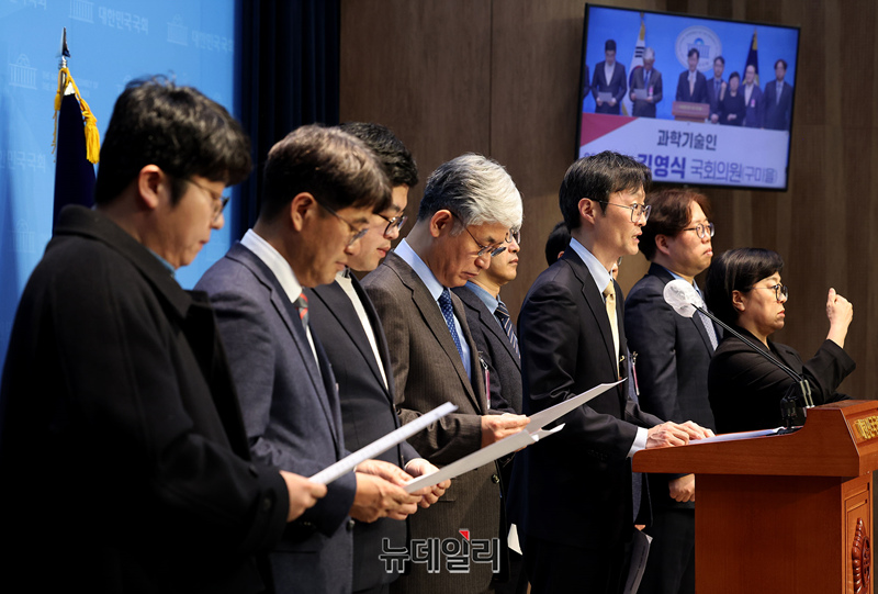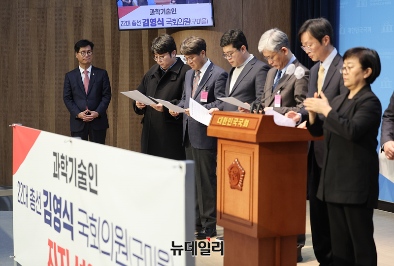 과학기술분야 교수와 대학원생들이 23일 오후 국회 소통관 기자회견장에서 김영식 구미을 국민의힘 의원을 지지선언을 하고 있다.