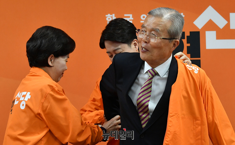 이준석 개혁신당 대표와 양향자 원내대표가 26일 국회에서 열린 최고위원회의에서 김종인 공천관리위원장에게 당 점퍼를 입혀주고 있다.