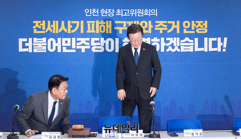 이재명 더불어민주당 대표가 26일 오전 인천시당에서 열린 현장 최고위원회의에 참석하고 있다. (인천=서성진 기자)
