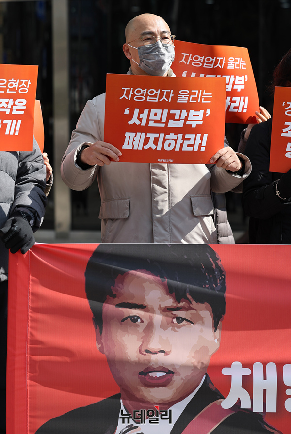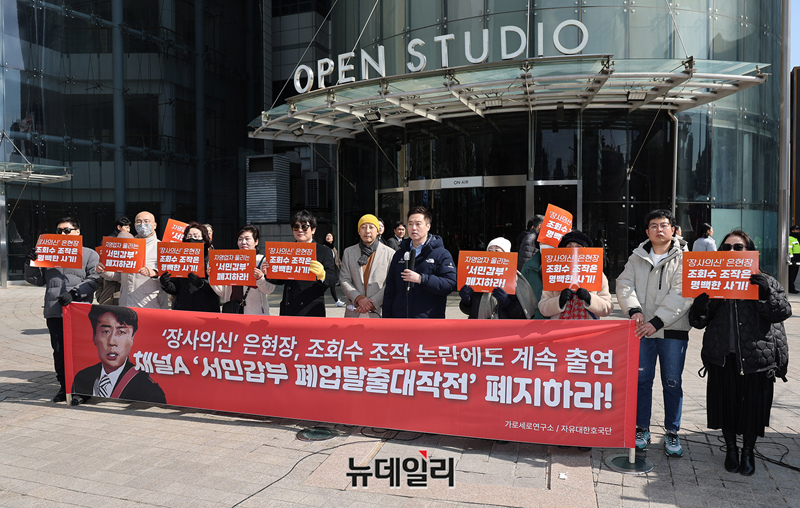 유튜브 가로세로연구소와 시민단체 자유대한호국단이 26일 오후 서울 종로구 채널A 앞에서 장사의신 은현장 씨의 채널A 프로그램 '서민갑부' 출연을 규탄하는 기자회견을 갖고 있다.이들은 "장사의신 은현장 씨가 조횟수 논란에도 서민갑부에 계속 출연하고 있다"며 프로그램 폐지를 촉구했다.3주전 유튜브 중단을 선언했던 은현장 씨는 "저로 인해 발생한 논란으로 놀라움과 실망감을 느꼈을 모든 분께 사과의 말씀을 드린다. 제 과오에 대해서는 반성하고, 비난도 달게 받겠다"며 유튜브에 복귀했다.