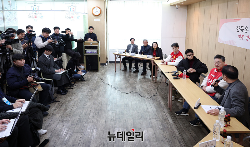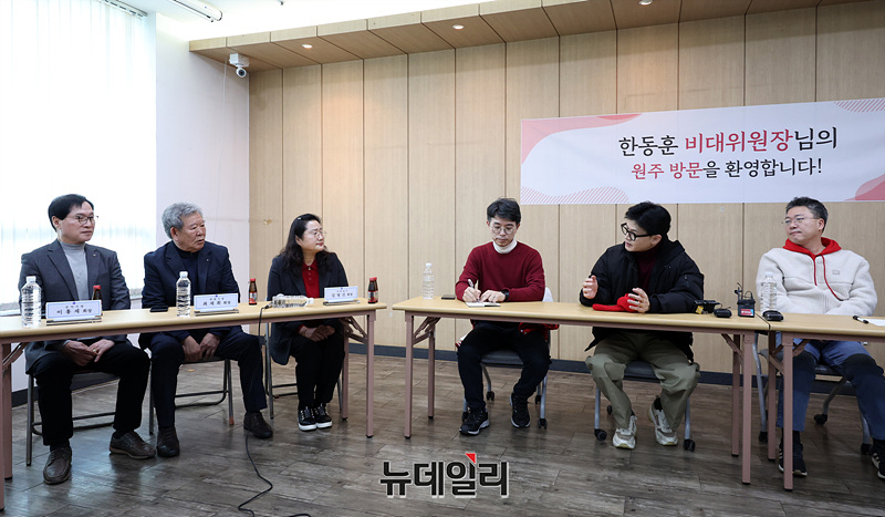 한동훈 국민의힘 비상대책위원장이 26일 오후 강원 원주시 자유시장에서 열린 전통시장 상인회 간담회에서 상인 대표들과 대화하고 있다. (강원 원주=서성진, 공동취재)