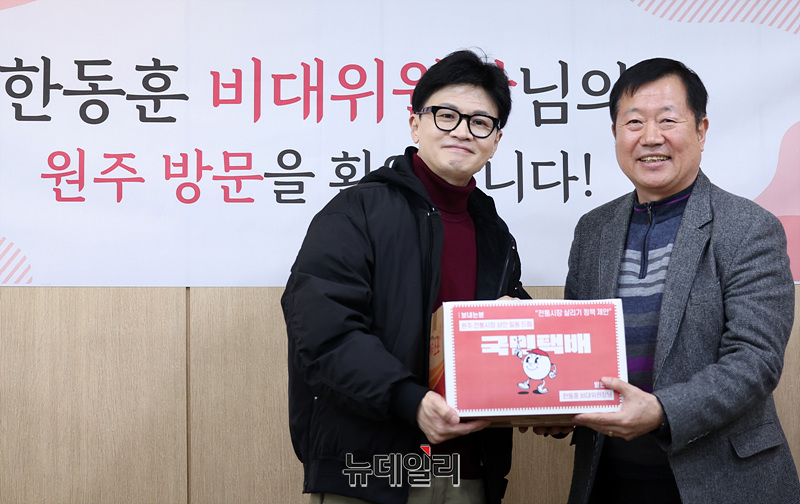 한동훈 국민의힘 비상대책위원장이 26일 오후 강원 원주시 자유시장에서 열린 전통시장 상인회 간담회에서 백귀현 원주중앙시장 상인회장으로부터 전통시장 살리기 정책 제안이 담긴 국민택배 상자를 받고 기념촬영을 하고 있다. (강원 원주=서성진, 공동취재)