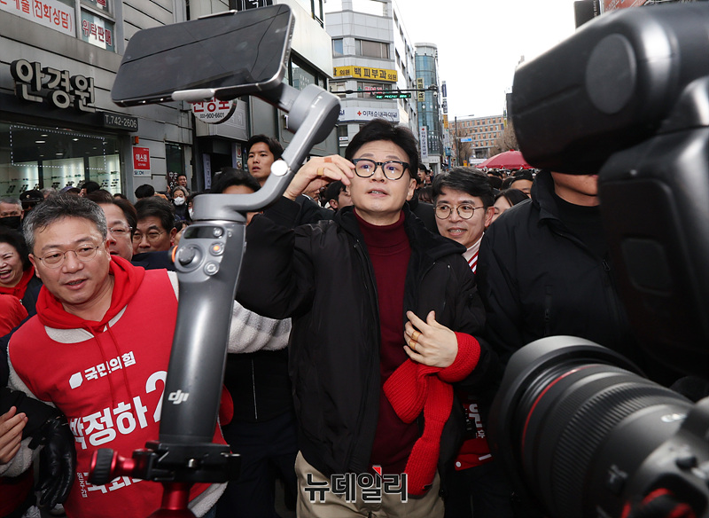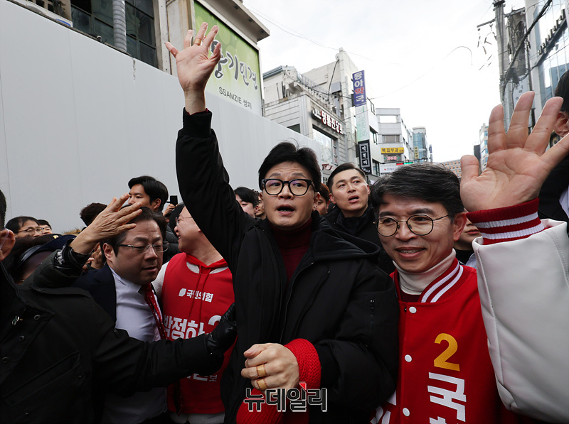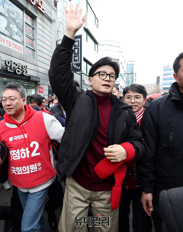 한동훈 국민의힘 비상대책위원장이 26일 강원 원주시 원주중앙시장에서 시민들에게 인사를 나누고 있다. (강원 원주=서성진, 공동취재)