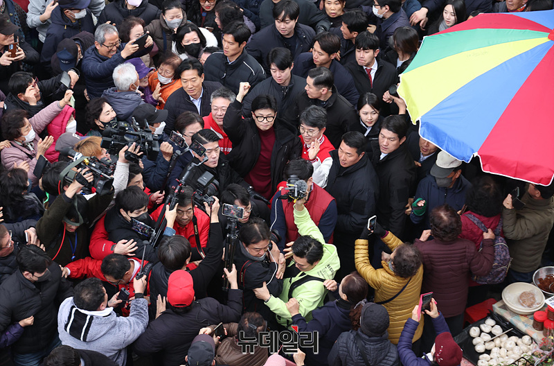 한동훈 국민의힘 비상대책위원장이 26일 강원 원주시 원주중앙시장에서 시민들에게 인사를 나누고 있다. (강원 원주=서성진, 공동취재)