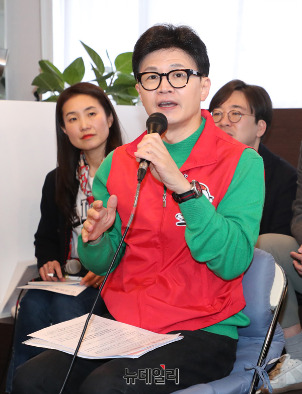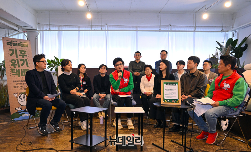 한동훈 국민의힘 비상대책위원장이 27일 오전 서울 성동구의 한 북카페에서 기후 미래 스타트업 창업자들에게 '기후 미래 택배'를 전달한 뒤 발언하고 있다.