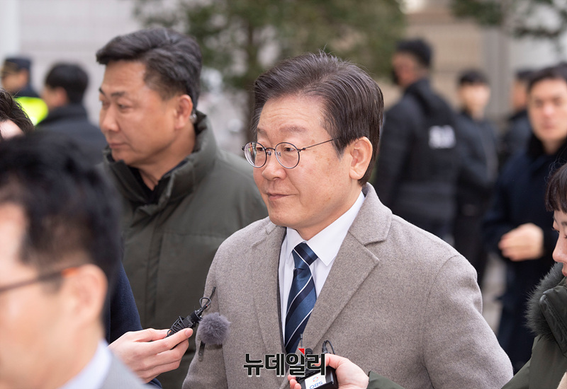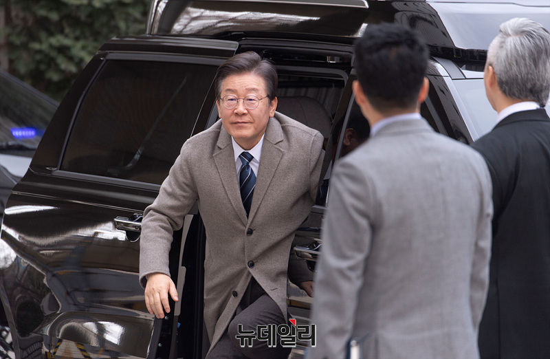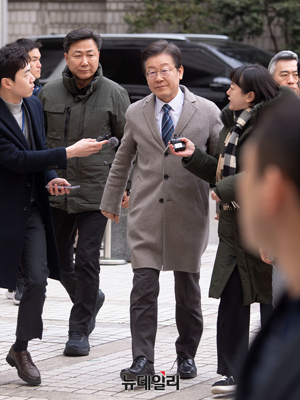 이재명 더불어민주당 대표가 27일 오전 서울 서초구 중앙지법에서 열린 특정범죄가중처벌등에관한법률 위반(뇌물) 등 2심 공판에 출석하고 있다.