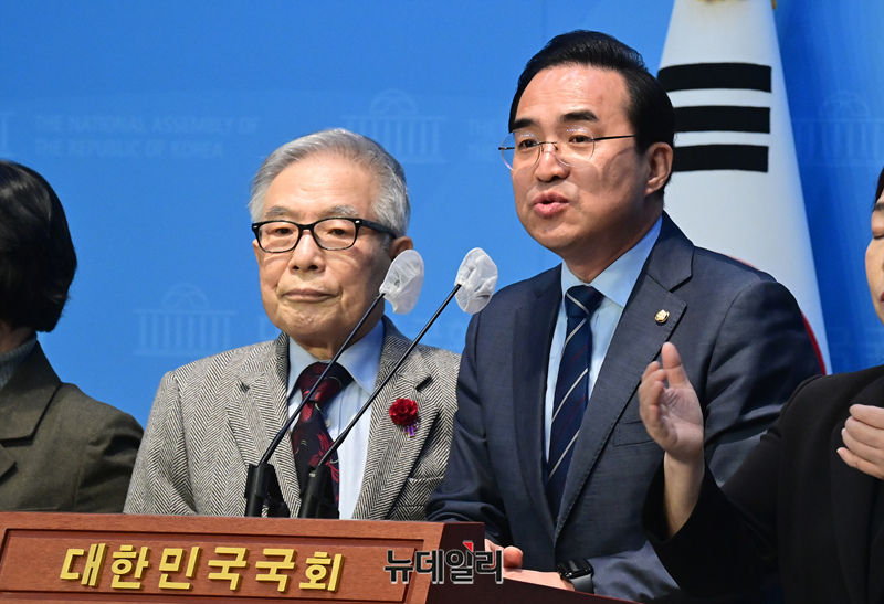 박홍근 더불어민주당 민주개혁진보 선거연합 추진단장이 27일 오전 국회 소통관에서 열린 가칭 '민주개혁진보연합' 비례대표 국민후보 추천 관련 기자회견에서 발언을 하고 있다.