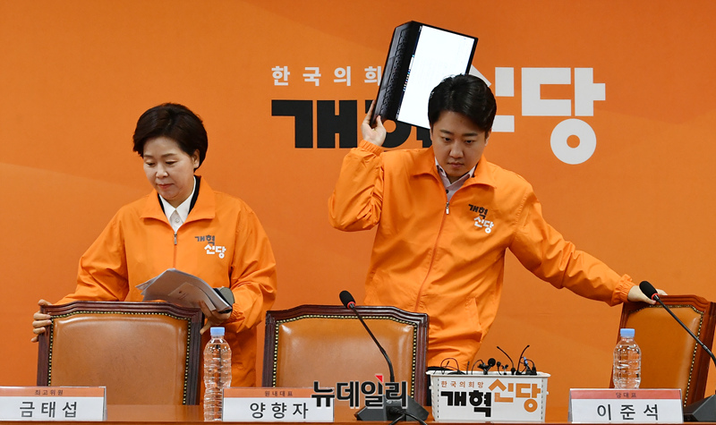 이준석 개혁신당 대표가 28일 국회에서 열린 최고위원회의에 참석하고 있다.