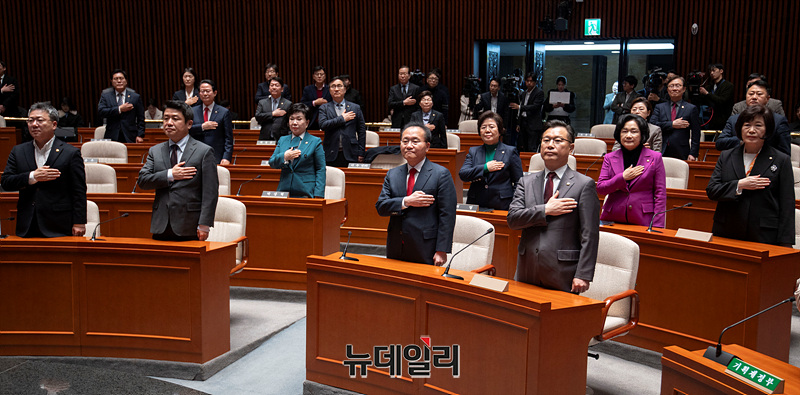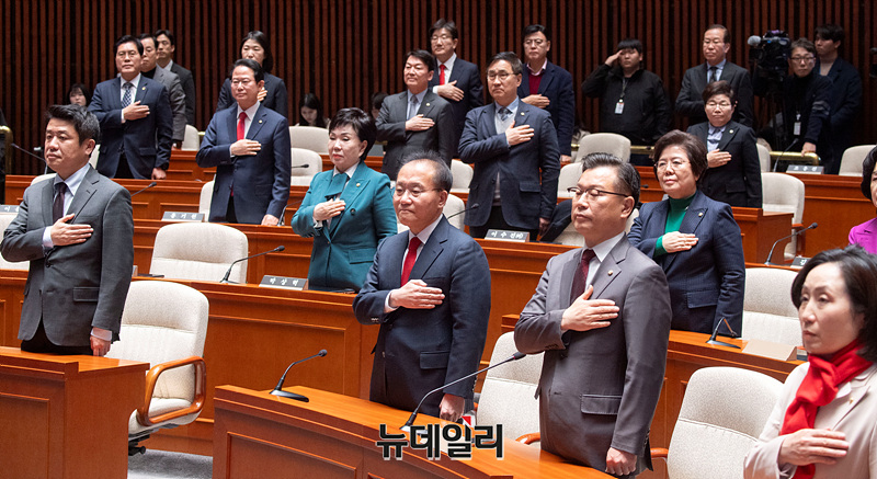 윤재옥 국민의힘 원내대표와 의원들이 28일 오후 국회에서 열린 의원총회에서 국민의례를 하고 있다.