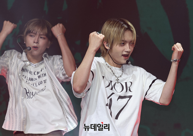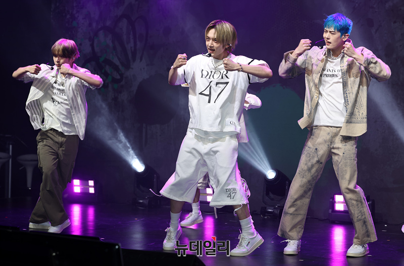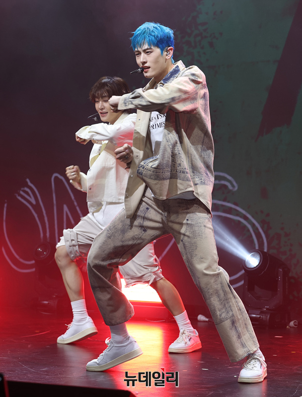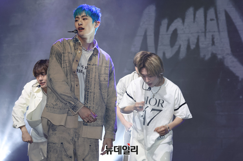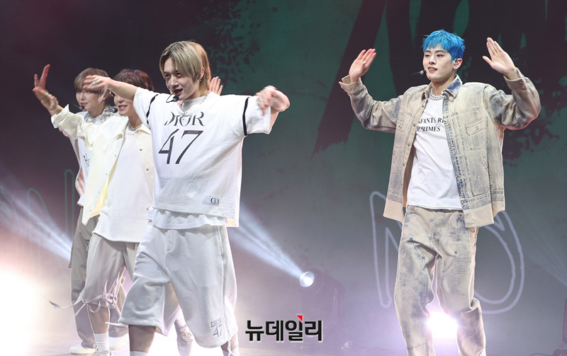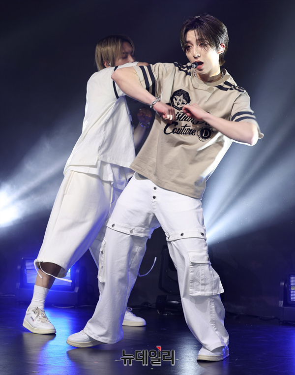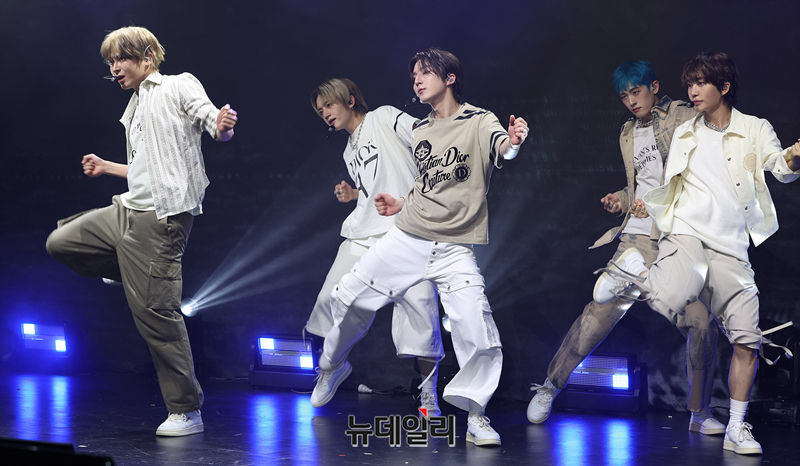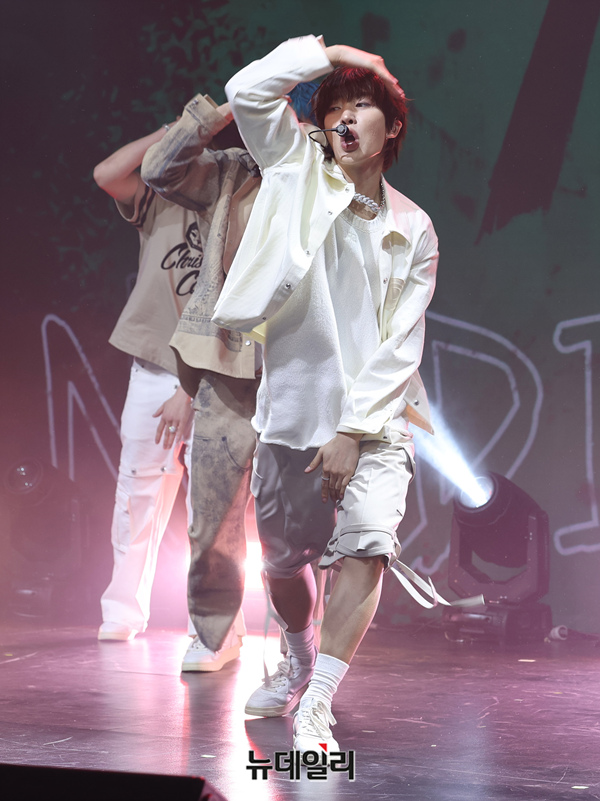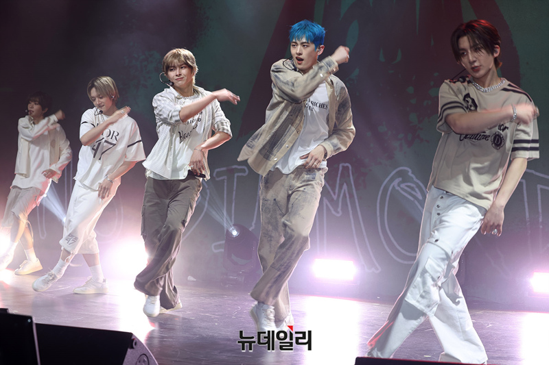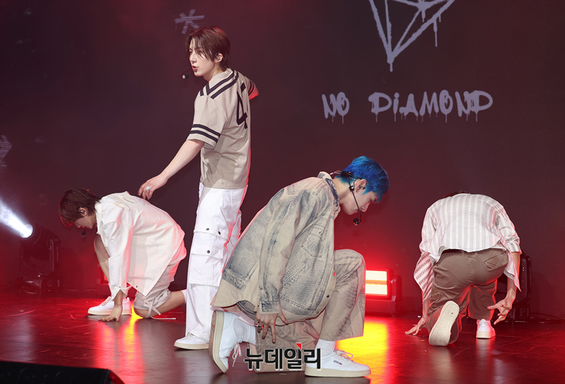 아이돌그룹 노매드(NOMAD)가 28일 오전 서울 강남구 성암아트홀에서 열린 데뷔앨범 쇼케이스에서 더블타이틀곡 '노 플레셔' 무대를 선보이고 있다.