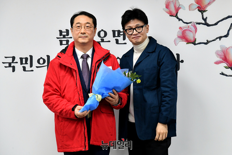 한동훈 국민의힘 비상대책위원장이 29일 서울 여의도 중앙당사에서 열린 국민인재 영입 환영식에서 김건 전 외교부 한반도평화교섭본부장에게 꽃다발을 전달하고 있다.