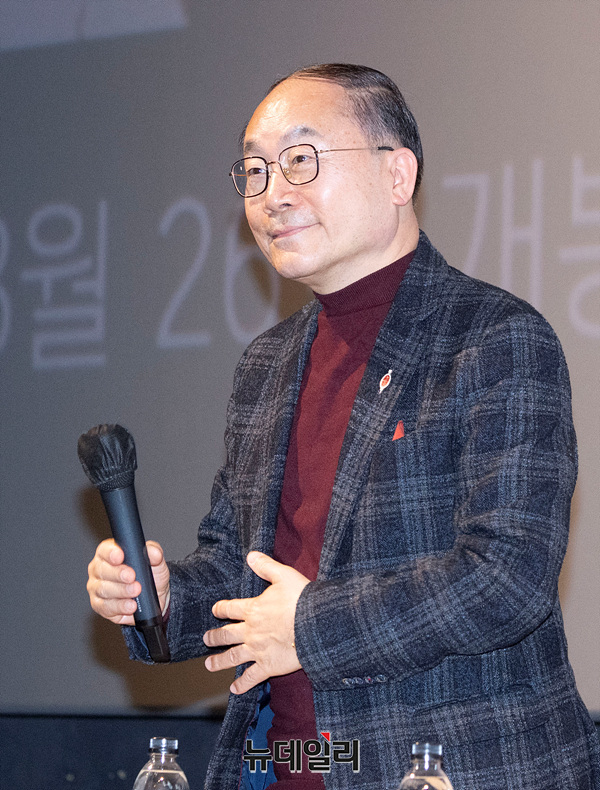 원성웅 목사가 29일 오후 서울 CGV 용산아이파크몰에서 열린 영화 '건국전쟁2 : 인간 이승만' 제작발표회에서 인사말을 하고 있다.