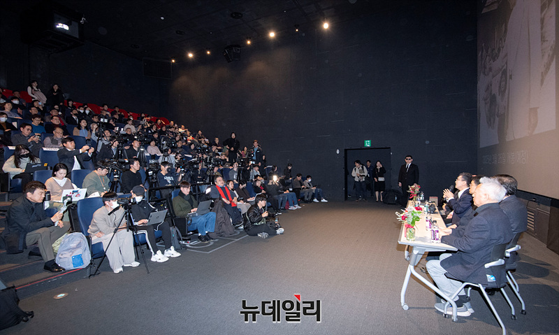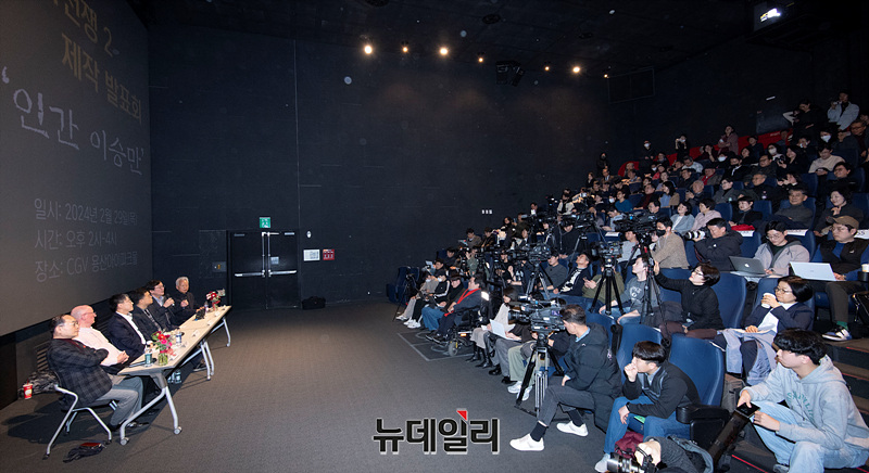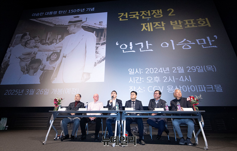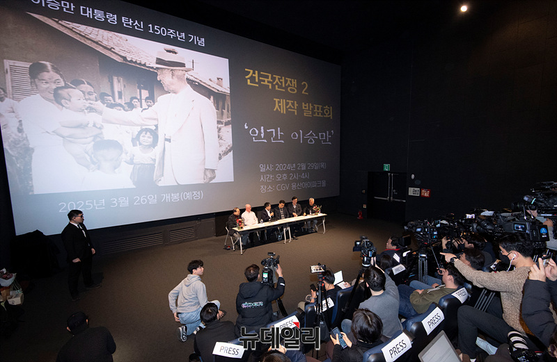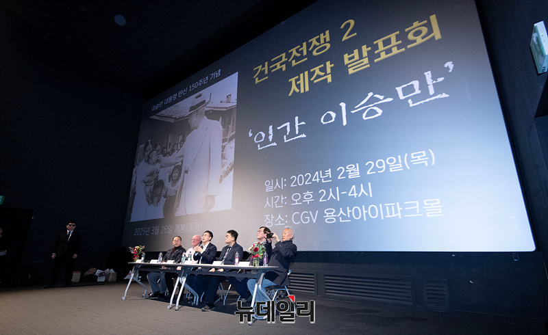 김덕영 감독이 29일 오후 서울 CGV 용산아이파크몰에서 열린 영화 '건국전쟁2 : 인간 이승만' 제작발표회에서 영화를 소개하고 있다.