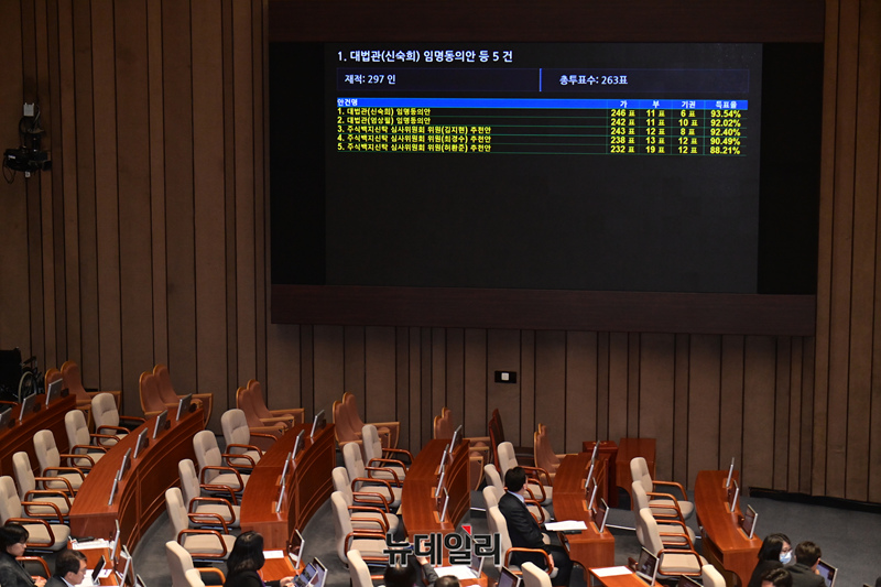 신숙희·엄상필 대법관 후보자에 대한 임명동의안이 29일 국회에서 열린 본회의에서 통과되고 있다.