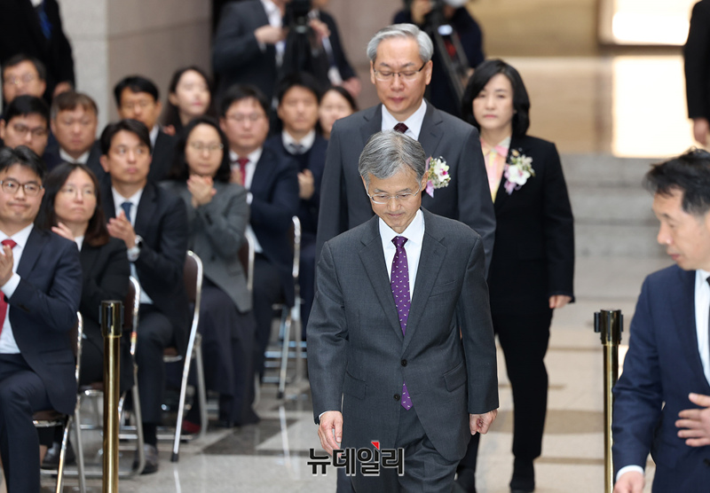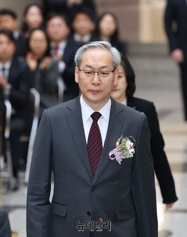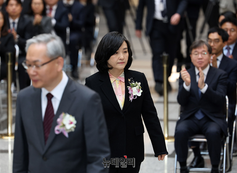 엄상필, 신숙희 신임 대법관이 4일 오전 서울 서초구 대법원 중앙홀에서 열린 취임식에 조희대 대법원장과 함께 입장하고 있다.