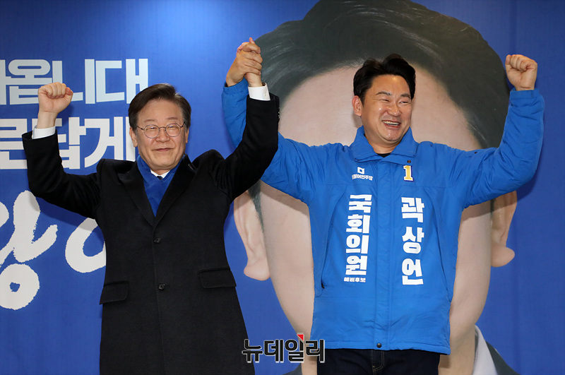 이재명 더불어민주당 대표가 4일 오후 서울 종로구 곽상언 후보자 사무실 지지방문에서 곽 후보자와 부인 노정연 고 노무현 전 대통령 딸과 손을 잡고 인사하고 있다.