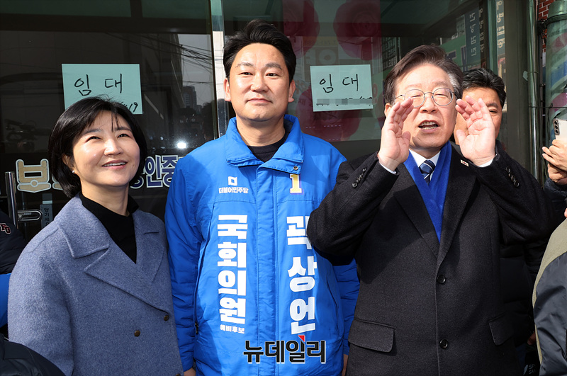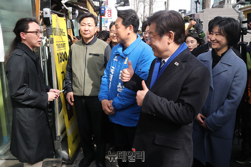 이재명 더불어민주당 대표와 곽상언 후보자가 4일 오후 서울 종로구 창신시장에서 시민들과 인사를 나누고 있다.