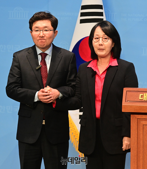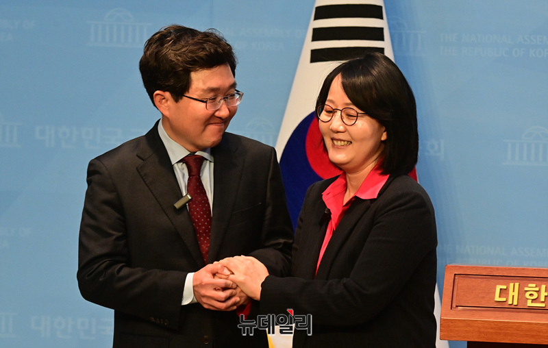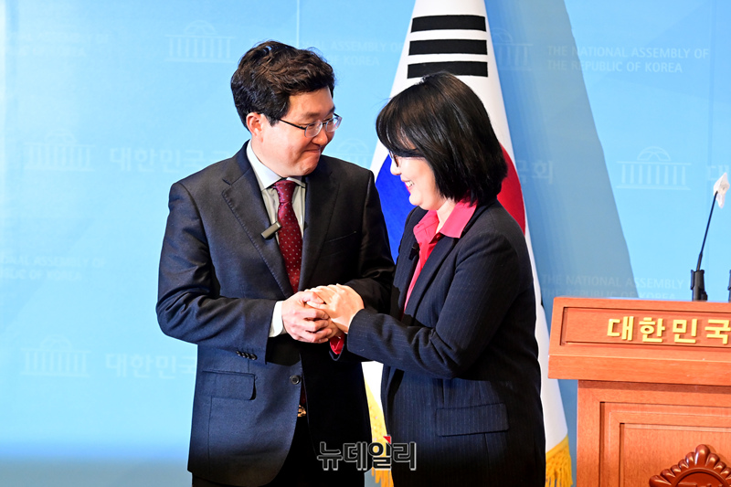 김용태 전 의원이 5일 오전 국회 소통관에서 제22대 총선 고양정 출마선언 기자회견을 마친 뒤 김현아 전 의원과 손을 잡고 있다.