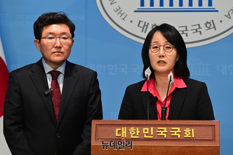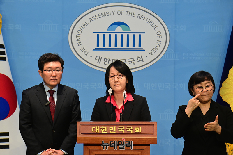 국민의힘 경기 고양정 단수추천을 받았다가 공천 취소 된 김현아 전 의원 5일 오전 국회 소통관에서 해당 지역구에 추천된 김용태 전 의원 지지 발언은 하고 있다.