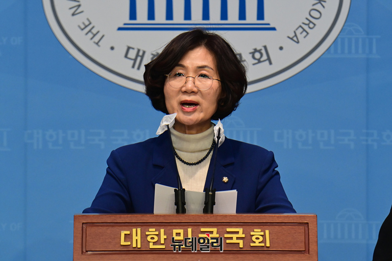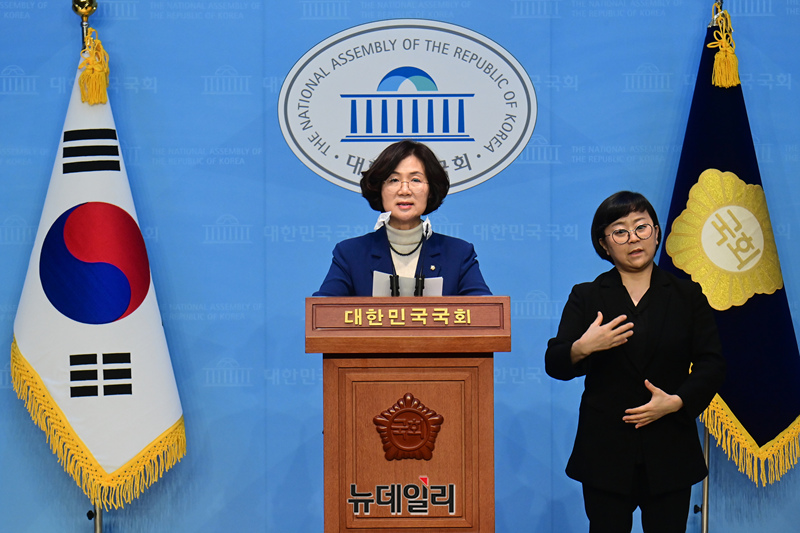 권인숙 더불어민주당 의원이 5일 오전 국회 소통관에서 이른바 '김건희 특검법' 대표 발의와 관련한 기자회견을 갖고 있다.