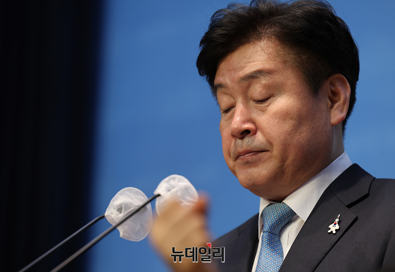 컷오프(공천배제) 결정을 받은 기동민 더불어민주당 의원이 5일 오전 국회 기자회견장에서 공천과 관련해 입장을 밝히고 있다.