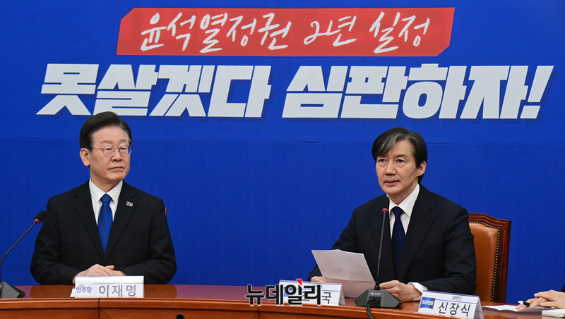 조국 조국혁신당 대표가 5일 오전 국회에서 열린 이재명 더불어민주당 대표와의 접견에서 인사말을 하고 있다.