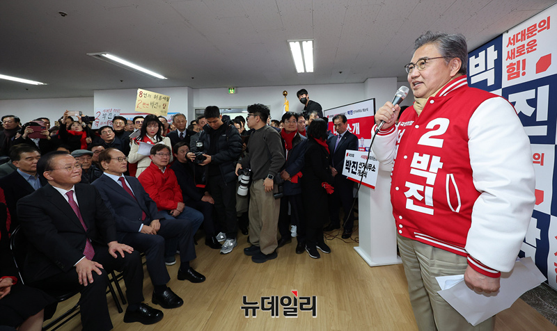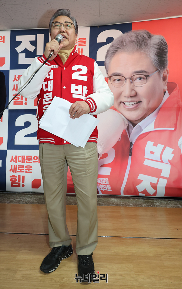 서울 서대문을 지역에 출사표를 던진 박진 국민의힘 의원이 5일 오후 서울 서대문구 연희로에서 열린 선거사무소 개소식에서 지지자들에게 인사말을 하고 있다.