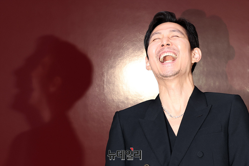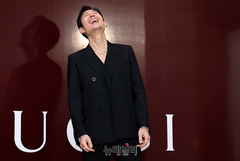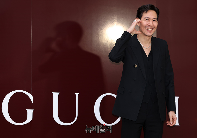 배우 이정재가 5일 오후 서울 강남구 갤러리아백화점 명품관에서 열린 구찌 '앙코라(Gucci Ancora)' 팝업스토어 오픈 행사에서 취재진의 볼하트 요청에 함박웃음을 짓고 있다.