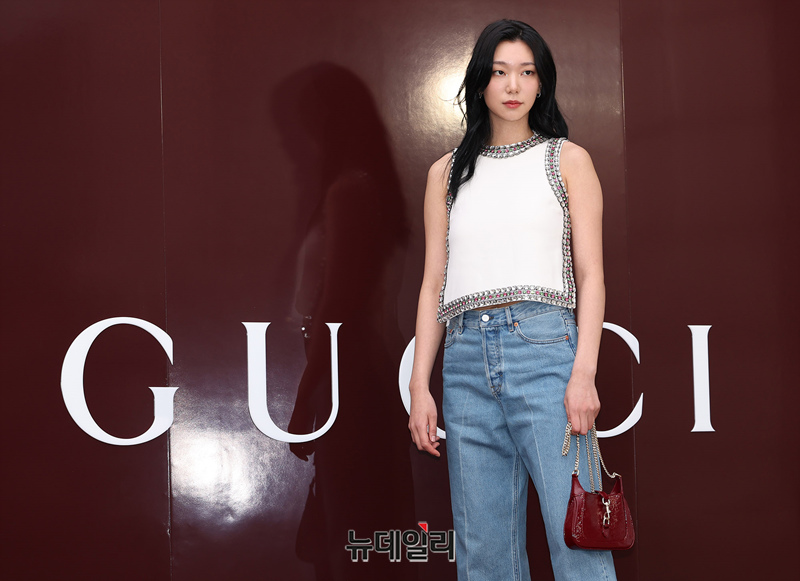 모델 이호정이 5일 오후 서울 강남구 갤러리아백화점 명품관에서 열린 구찌 '앙코라(Gucci Ancora)' 팝업스토어 오픈 행사에서 포즈를 취하고 있다.